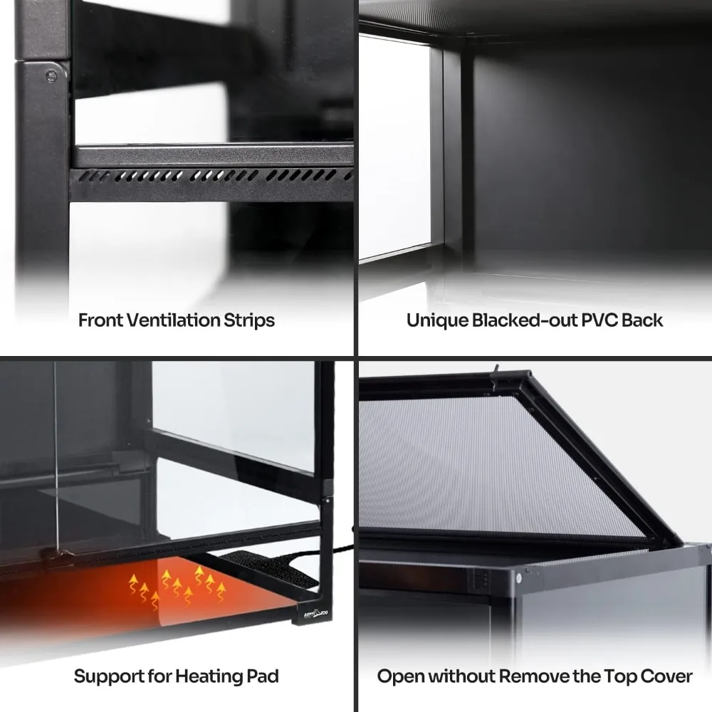 - 【One-hand Opening Door & Unique Blacked-out Back】: Detachable double front hinge doors with “one-hand opening” door locks allow easy access for maintenance and feeding,Give you plenty of decoration space for your terrarium;Unique blacked-out PVC back to reduce stress for the animals, it looks good even without any decoration.