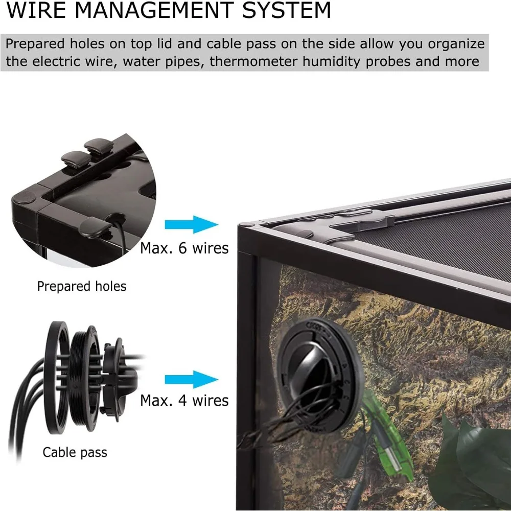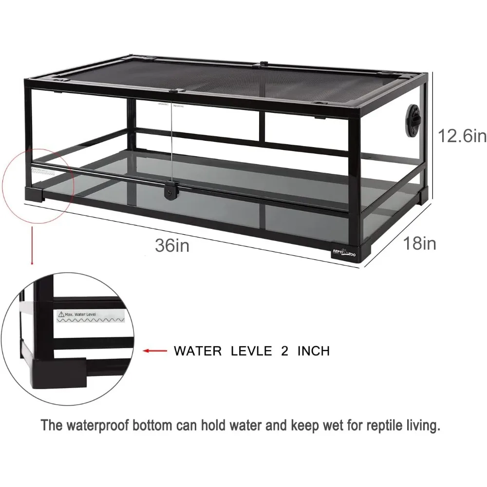 - 【Top Screen Ventilation】Thin wire top screen provides ventilation and allows uvb and infrared penetration. Raised bottom frame can be fit a substrate heater; Waterproof bottom makes this 35 gallon tank can be used both as desert terrarium and rainforest tank.